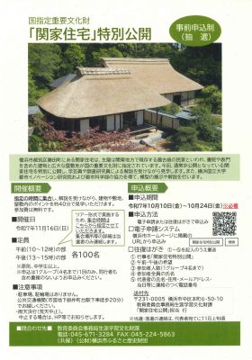 - 都筑区勝田町にある関家住宅は、主屋は関東地方で現存する最古級の民家といわれ、書院や表門を含めた建物と広大な屋敷地が国の重要文化財に指定されています。今回通常非公開となっている関家住宅を特別に公開し、学芸員や調査研究員による解説を受けながら見学します。また、横浜国立大学都市イノベーション研究院および都市科学部の協力を得て、模型の展示や解説を行います。