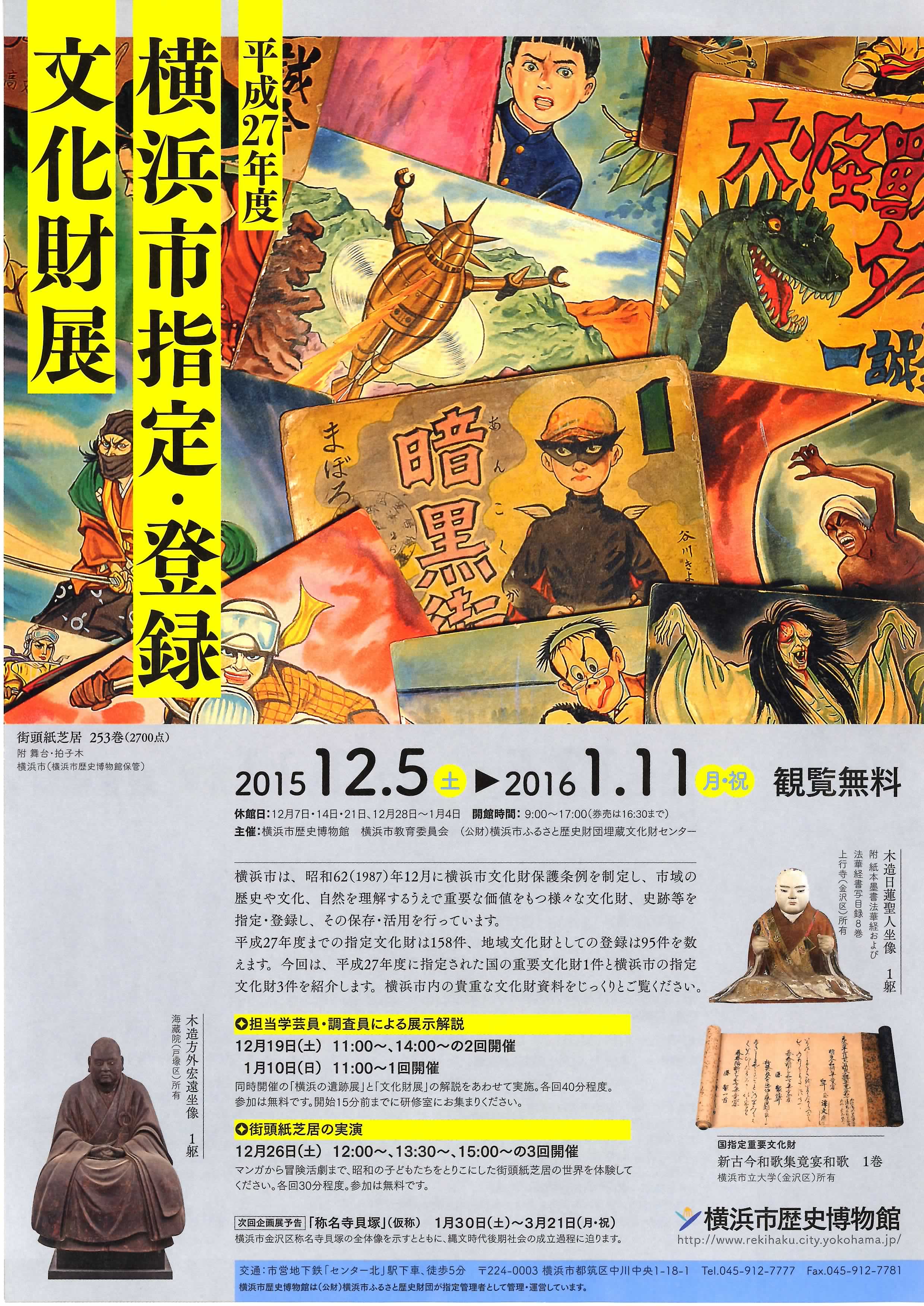 横浜市が昭和62年に制定した横浜市文化財保護条例に基づき、指定・登録された文化財を公開します。今回は平成27年度に指定された国の重要文化財1件と横浜市の指定文化財3件を中心に紹介します。