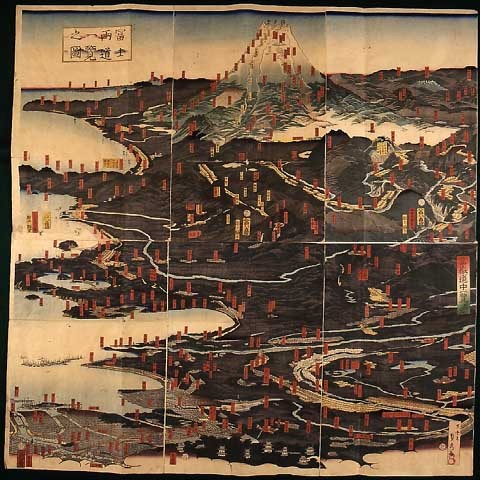歌川(五雲亭)貞秀作。安政6年(1859)。江戸より富士山にいたる道筋を鳥瞰図として描いたもの。両道とは、東海道と甲州街道を示すものと思われる。19世紀に入ると、江戸やその周辺地域で、富士山を信仰対象とする富士講が盛んとなり、富士山に多くの人々が登るようになった。本資料の作成もそうした富士信仰の隆盛と関連したものと思われる。左下に江戸の町が置かれ、左側を上部に進む形で東海道が、右側を若干回り込むようにしながら上部に進む形で甲州街道が、それぞれ描かれている。中央上部には富士山がまさに聳えるように描かれており、御殿場口や吉田口といった登山道が見える。なお、右下にみえる「富嶽道中一覧 其二」の意味は不明である。
