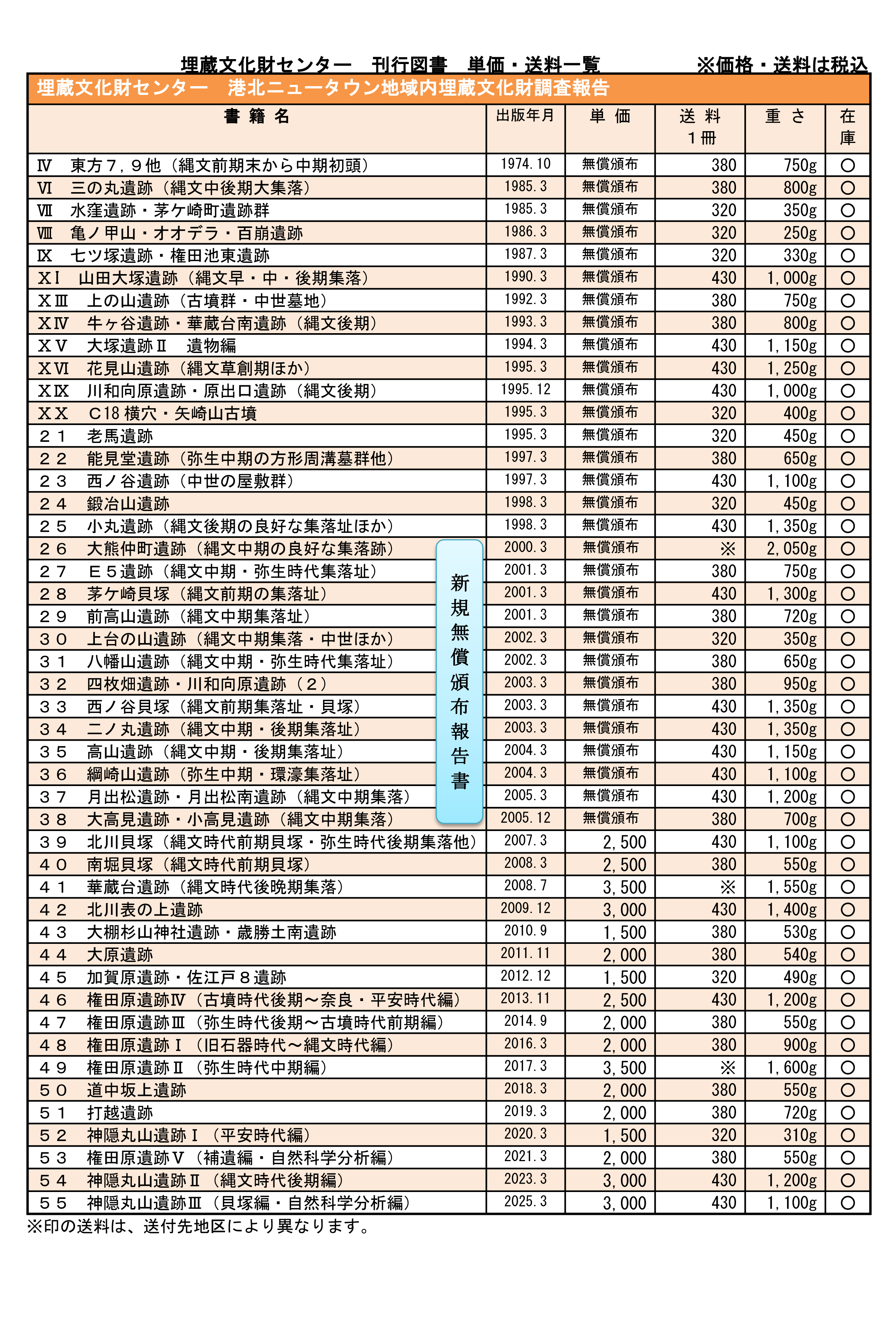 ○港北ニュータウン地域内埋蔵文化財調査報告書 無償頒布一覧